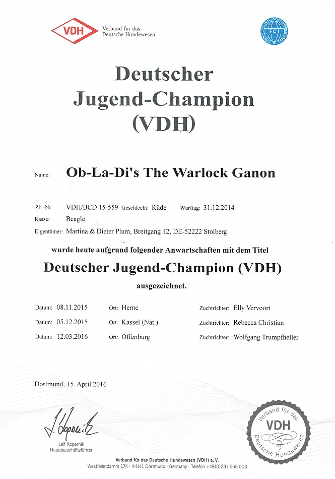 VDH. Auf der Internationalen Ausstellung wurde Ganon mit vorzüglich 3 bewertet. Wir sind